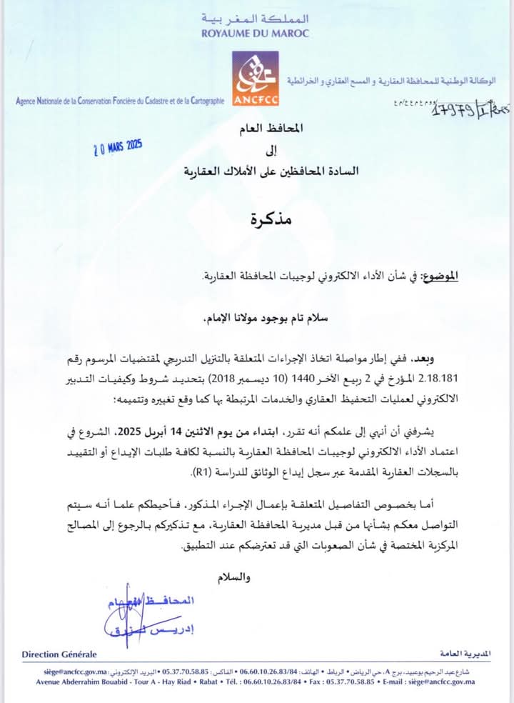 في خطوة جديدة نحو الرقمنة وتحديث الخدمات العقارية، أعلنت الوكالة الوطنية للمحافظة العقارية والمسح العقاري والخرائطية (ANCFCC) عن الشروع في اعتماد الأداء الإلكتروني لرسوم المحافظة العقارية، وذلك ابتداءً من يوم الاثنين 14 أبريل 2025.
