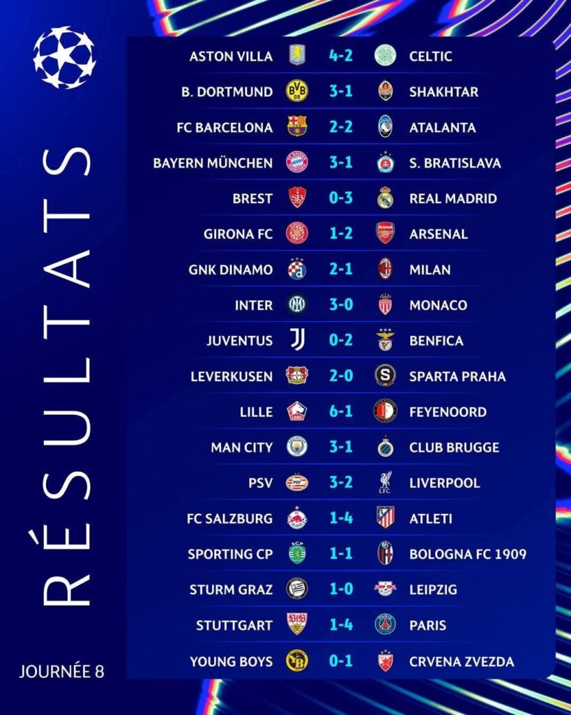 انتهت المباراة بالتعادل 2-2، ليصل رصيد برشلونة إلى 19 نقطة، ويضمن تأهله المباشر إلى دور الـ16. وحل ريال مدريد ضيفًا على بريست الفرنسي.