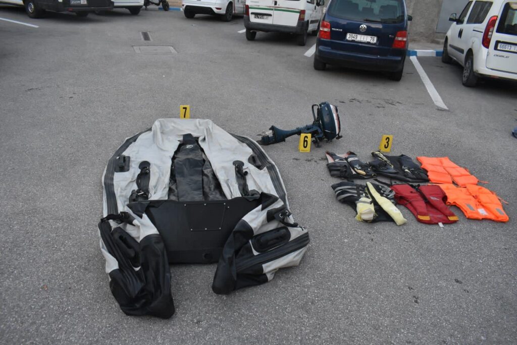 وقد مكنت عمليات التفتيش التي واكبت هذه العملية الأمنية من ضبط قارب مطاطي مزود بمحرك بحري ومجموعة من سترات النجاة، فضلا عن ضبط مجموعة من المعدات المستعملة في الملاحة البحرية.
